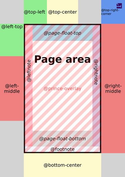 The figure above shows the position of some page-margin boxes, which can be used for creating running page headers and footers, as well as some common regions in the main page area.