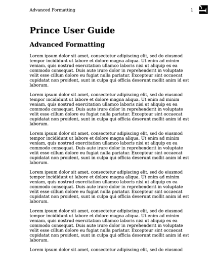 So far we have discussed forcing a page break, however suppressing page breaks is also important. For example, it is poor style to have a page break between a header and the first paragraph of a section. Therefore, the default Prince stylesheet will use the break-after property to suppress page breaks immediately after headers: