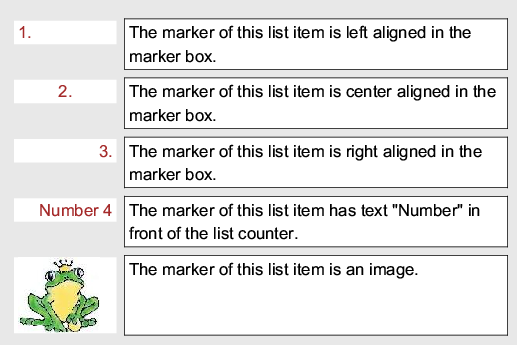 list-style-type applies to list items and determines the type of marker that they receive. The following table shows examples of the various list style types (also supported are octal, binary, lower-hexadecimal and upper-hexadecimal).