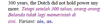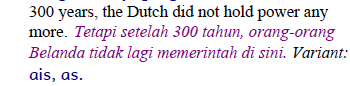 <span class="Example_Sentence_National">Tetapi setelah 300 tahun, orang-orang Belanda tidak lagi memerintah di sini.</span>