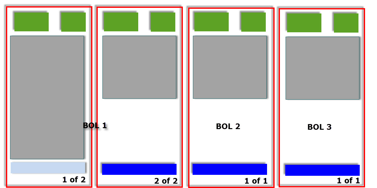 BOL 1's items occupy more than one page, so I need to suppress the totals section on page 1 (light blue), but block out the space (as the pre printed form still has boxes there). I then need to continue the content onto page 2 and display the totals on page 2 (assuming they fit).