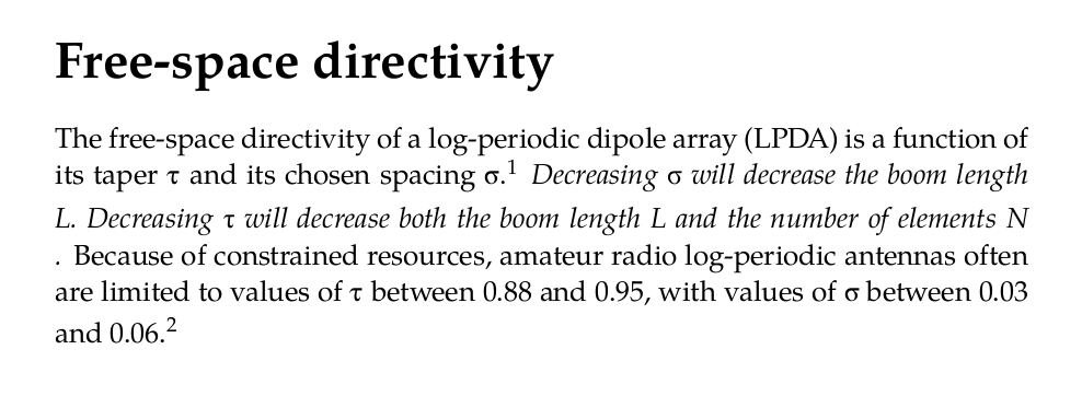 <p>The free-space directivity of a log-periodic dipole array (LPDA) is a function of its taper <math display="inline" xmlns="http://www.w3.org/1998/Math/MathML"><mrow><mi>τ</mi></mrow></math> and its chosen spacing <math display="inline" xmlns="http://www.w3.org/1998/Math/MathML"><mrow><mi>σ</mi></mrow></math>.<span class="citation"><sup>1</sup></span> <strong>Decreasing <math display="inline" xmlns="http://www.w3.org/1998/Math/MathML"><mrow><mi>σ</mi></mrow></math> will decrease the boom length <math display="inline" xmlns="http://www.w3.org/1998/Math/MathML"><mrow><mi>L</mi></mrow></math>. Decreasing <math display="inline" xmlns="http://www.w3.org/1998/Math/MathML"><mrow><mi>τ</mi></mrow></math> will decrease both the boom length <math display="inline" xmlns="http://www.w3.org/1998/Math/MathML"><mrow><mi>L</mi></mrow></math> and the number of elements <math display="inline" xmlns="http://www.w3.org/1998/Math/MathML"><mrow><mi>N</mi></mrow></math>.</strong> Because of constrained resources, amateur radio log-periodic antennas often are limited to values of <math display="inline" xmlns="http://www.w3.org/1998/Math/MathML"><mrow><mi>τ</mi></mrow></math> between 0.88 and 0.95, with values of <math display="inline" xmlns="http://www.w3.org/1998/Math/MathML"><mrow><mi>σ</mi></mrow></math> between 0.03 and 0.06.<span class="citation"><sup>2</sup></span></p>