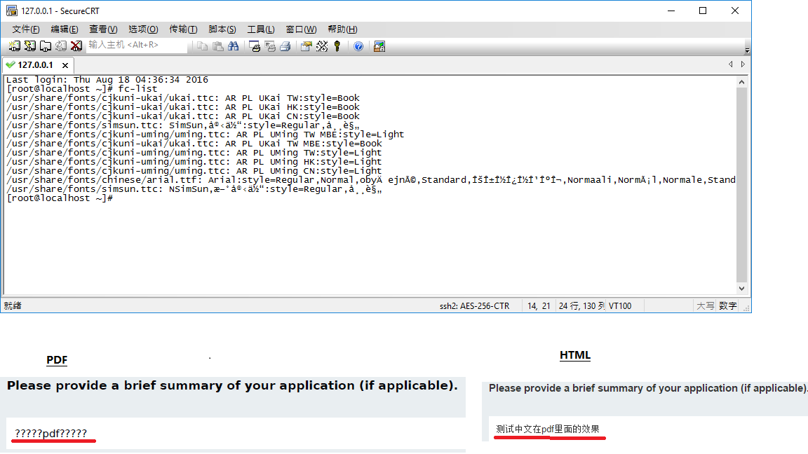 Oh, so the PDF is working but not the terminal? That is a different question, I didn't realise. Now it depends which terminal application you are using, and how you are connecting to the server. But do you even need to see Chinese characters in the terminal itself?