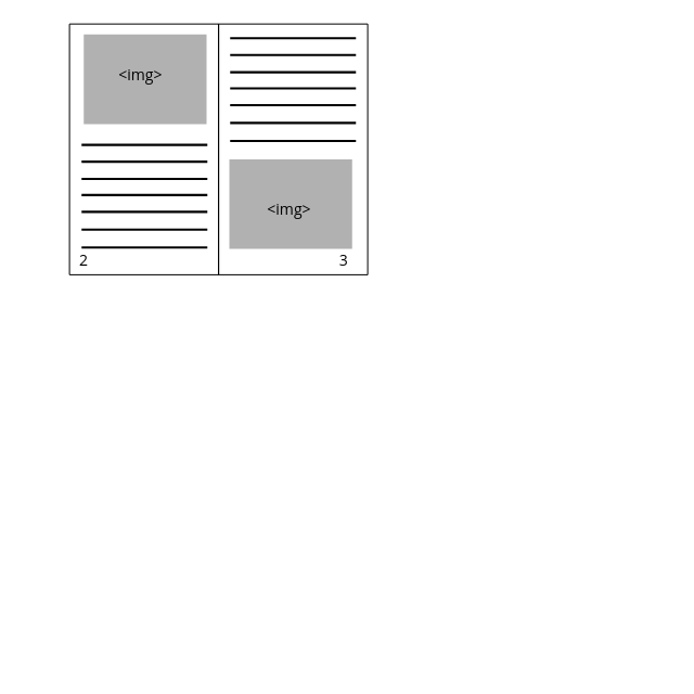 For example, I have two <img> and I want set them "float: top" for left page and "float: bottom" for right page