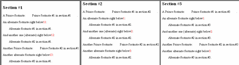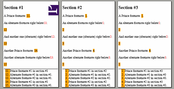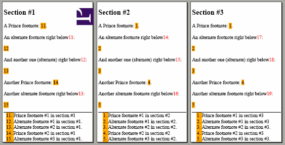While I love how simple Prince makes turning some inline text into footnotes, that solution just doesn't cut it for some of my documents. For these, due to the nature of the text, the extension of the notes, or both, I use different markup. I've tried to make these work, but I'm kind of stuck halfway.