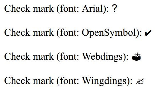 Instead of seeing a checkmark, a ? will display. The convert log says "no font for Dingbats character U+2714, fallback to '?'