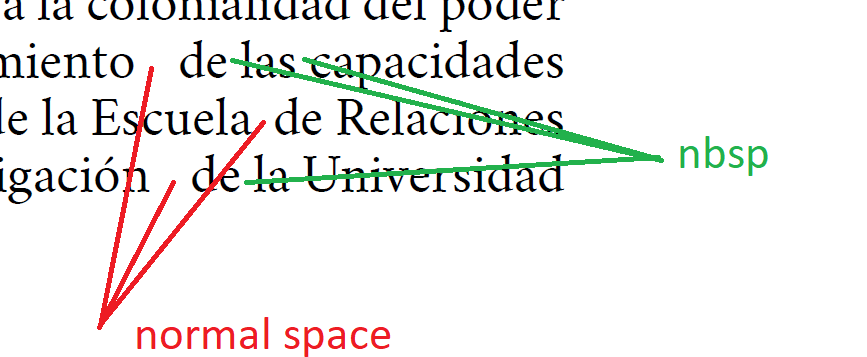 In a few paragraphs, I am adding some non-breaking-spaces. The problem is that those nbsp have different width compared to normal spaces (the nbsp look smaller).