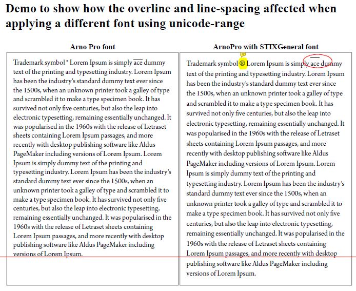 The trademark symbol looks small on the main font, so we need to apply a different font for that character using @font-face{ unicode-range }. We got the trademark symbol correct, but the overline and the line-spacing are affected.