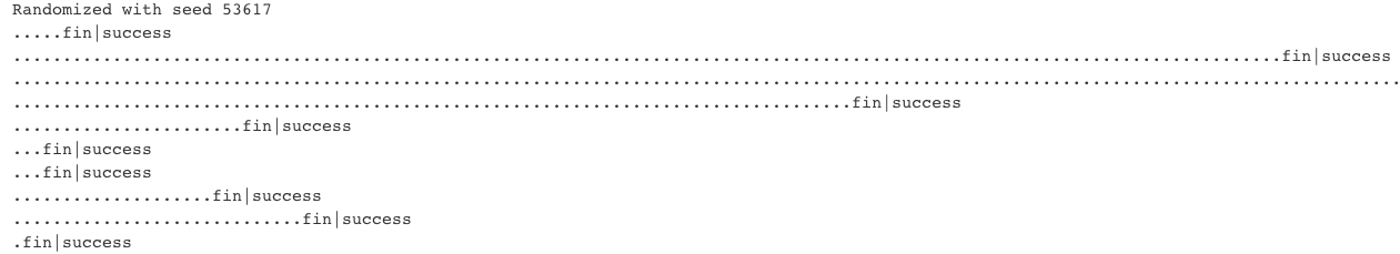 In our rspec test suite, we're testing that various PDFs are being generated. After each PDF is created, our test output is interrupted by the "fin|success" message, indicating that the PDF has completed.