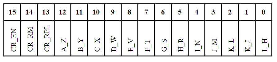 <tr><td>CR_EN</td><td>CR_RM</td><td>CR_RPL</td><td>A_Z</td><td>B_Y</td><td>C_X</td><td>D_W</td><td>E_V</td><td>F_T</td><td>G_S</td><td>H_R</td><td>I_N</td><td>J_M</td><td>K_L</td><td>K_J</td><td>L_H</td></tr>