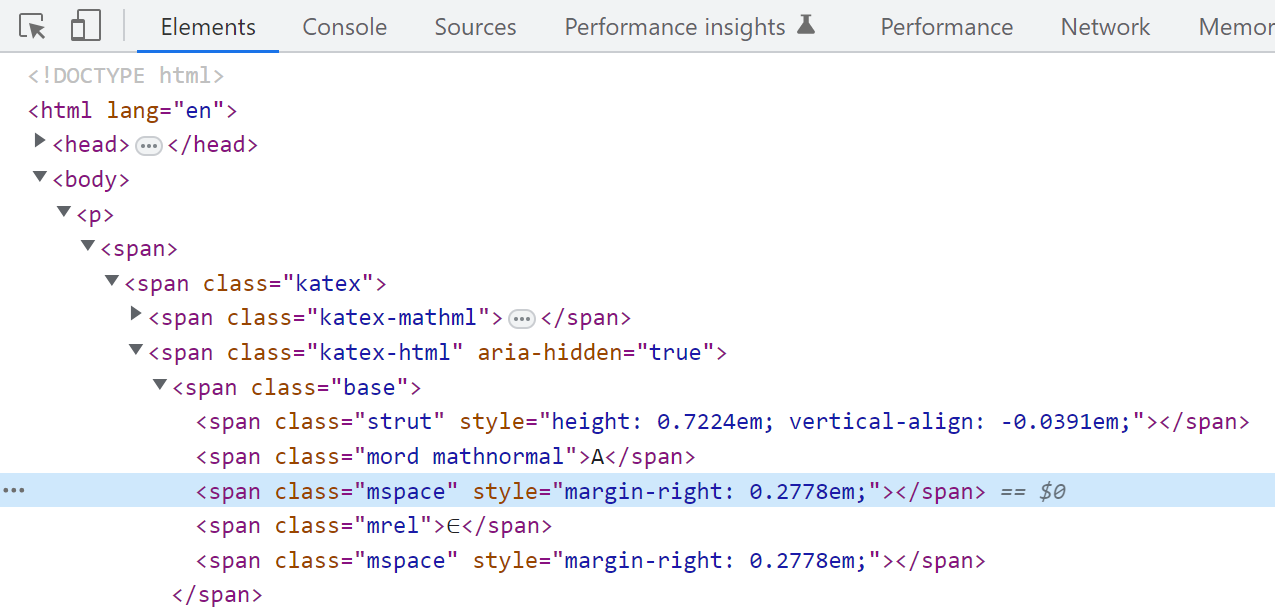 Thanks, and I'm sorry I wasn't clear in asking for "the xml that KaTeX generates for the above example". However, it looks as if what you sent at first might be helpful in diagnosing the problem: the first version renders with a spaced ‘∈’, while the second version (which has very different HTML: e.g. no mathml at all, and just a TeX expression to be processed by javascript) renders without spacing the ‘∈’. This suggests that the problem could be with the client-side javascript that converts the TeX.