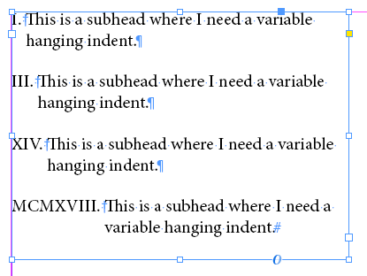 We use subheads that are numbered, and subsequent lines are indented to the position after the number. The number IDs have their own tag. Currently we have the indents set to be the same,