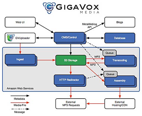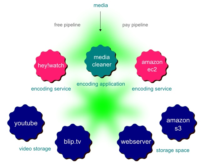 In the example above there are different choices about how to encode footage and store it. Most people would choose to encode it on their local machine with an application like Media Cleaner. However, if the person is using a laptop and does not have the raw processing power or time to spare, they need another way to get their footage out on to the internet. There are free services like hey!watch that will encode footage to almost any format, but it can take more than 24 hours. Soon there will be companies who will use EC2 to build a encoding service, which will mean a very quick turnaround and an SLA (for a price). Storage would work the same way, in that there will be choices between less reliable free services and more reliable pay services.
