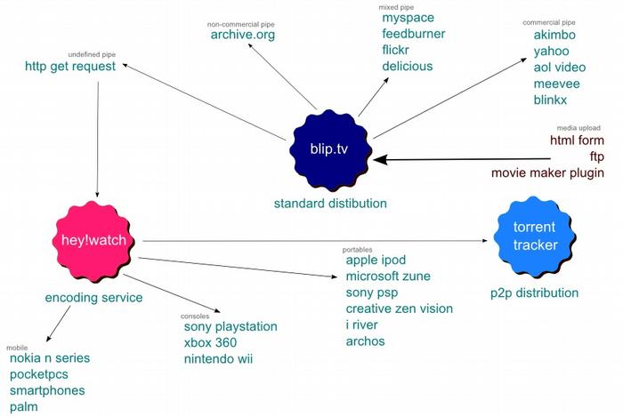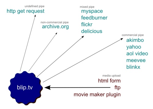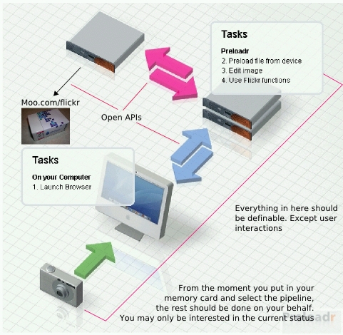 Once all these APIs and feeds are available to the user, its a matter of time before services and application are tied together for the benefit of the user instead of the service involved. In Figure 18, flickr actively allow there services to be chained together via their API because they make their revenue from people storing photos on their servers. Others like Blip.tv are doing the same but why does the user have to wait for the service to open up like the ones mentioned before. Specially now there are services like Mashery and Yahoo Pipes which can consume on-line services on behalf of the user.