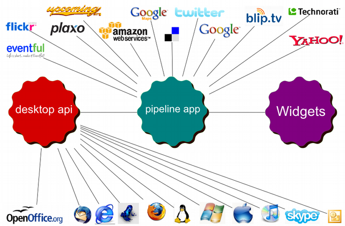 In Figure 15, I have split apart the desktop api, pipeline application and widget front end. This isn't necessarily ideal, I have been using RSSBus, Cocoon and Google Widgets to mock up how “flow” would work. In Figure 20, I draw up how Yahoo! could build a “flow” set-up using a different set of components.