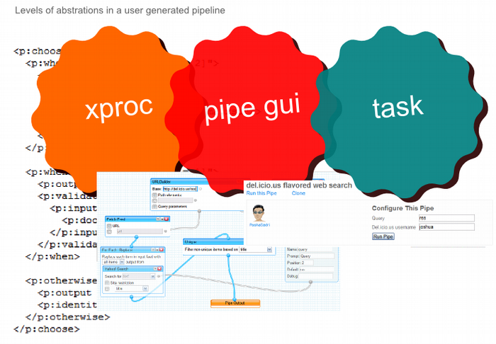 The final part of the puzzle is the pipeline. Learning from XML Pipelines and other pipelines before them. It is easy to imagine a future where pipelines are shared like Grease-monkey scripts today.