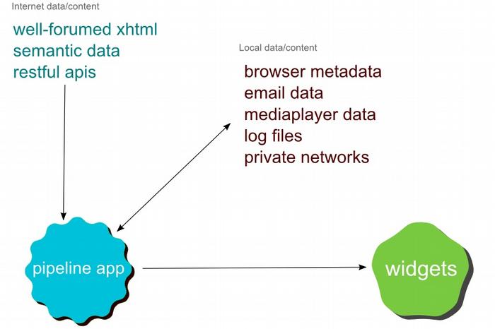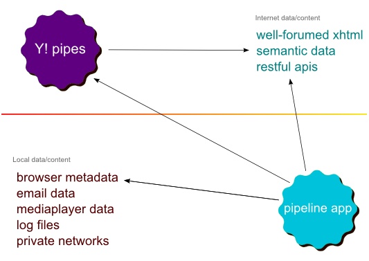 On the surface, Yahoo! Pipes seems to have done everything correctly, but in actual fact what they have built thus far is a very sexy interface to web data mixing tool. This is not too far removed from what Feedburner, RSS mix, Feedcombine, and others have been doing for a while. Yahoo! Pipes, while deserving credit for pushing pipelines into the mainstream, is very limited due to its lack of access to the desktop space and its proprietary nature.