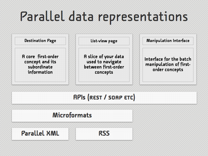 Tom Coates calls this Parallel data representation. In the end this means the web is becoming much more machine and pipeline addressable.