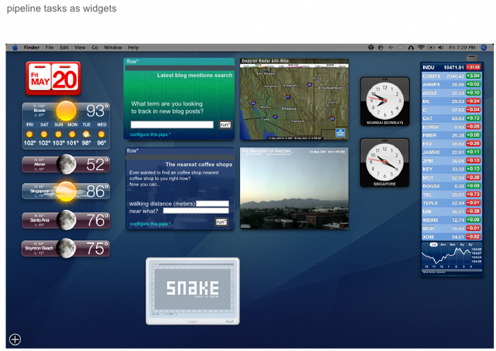 While looking for the perfect “Flow” application, I discovered that Yahoo! Widgets would make a great platform for the desktop space. The widget engine already has access to nearly everything on the desktop and it has an authenticated path back to the main server via the Yahoo! system. It also has many deep API hooks into different desktop applications (such as Outlook, iTunes, Winamp) and the operating system. Due to the authenticated path back to Yahoo!, it would be simple to combine Yahoo! Pipes with Yahoo! Widgets to create a “Flow” application.