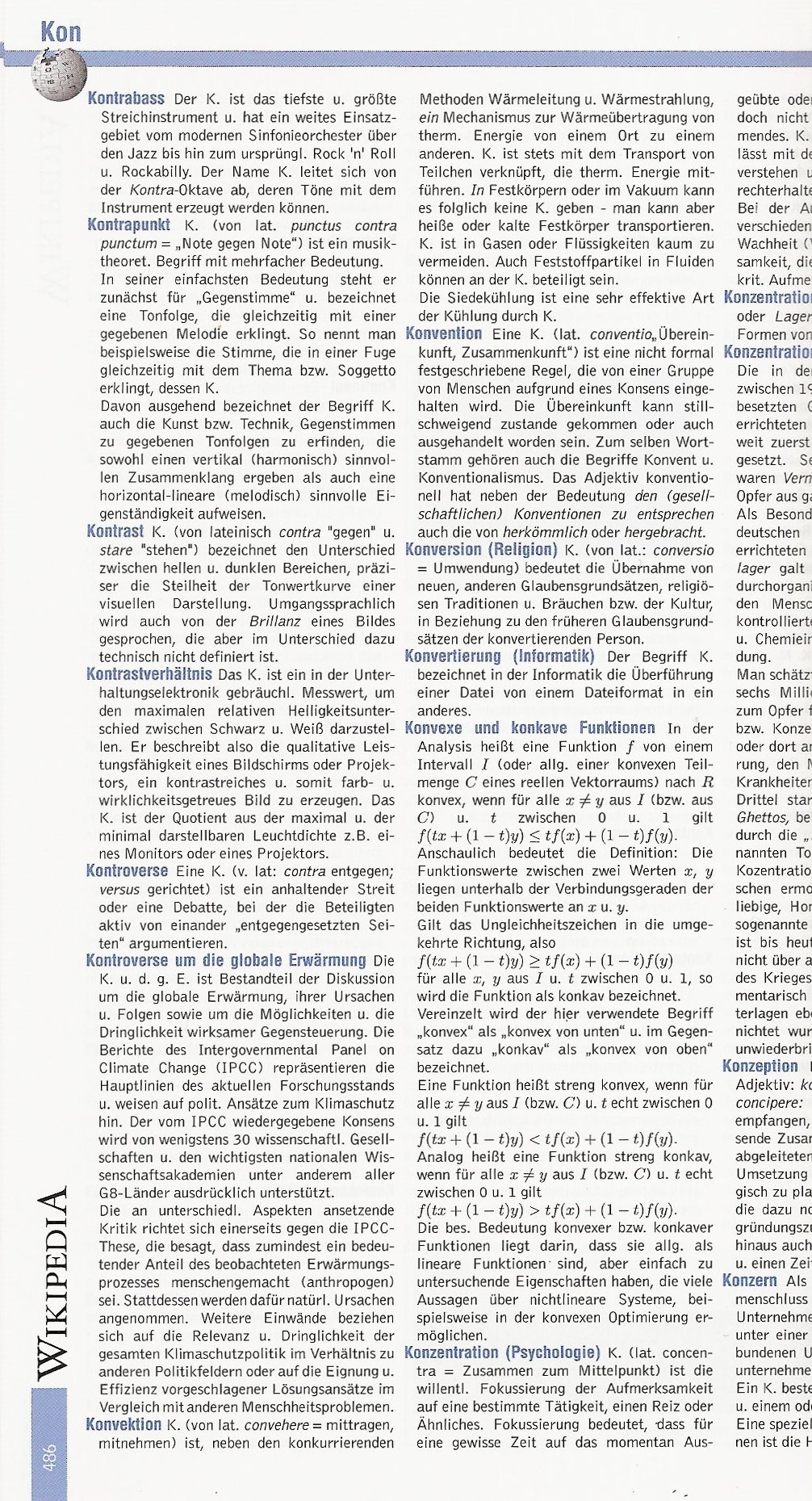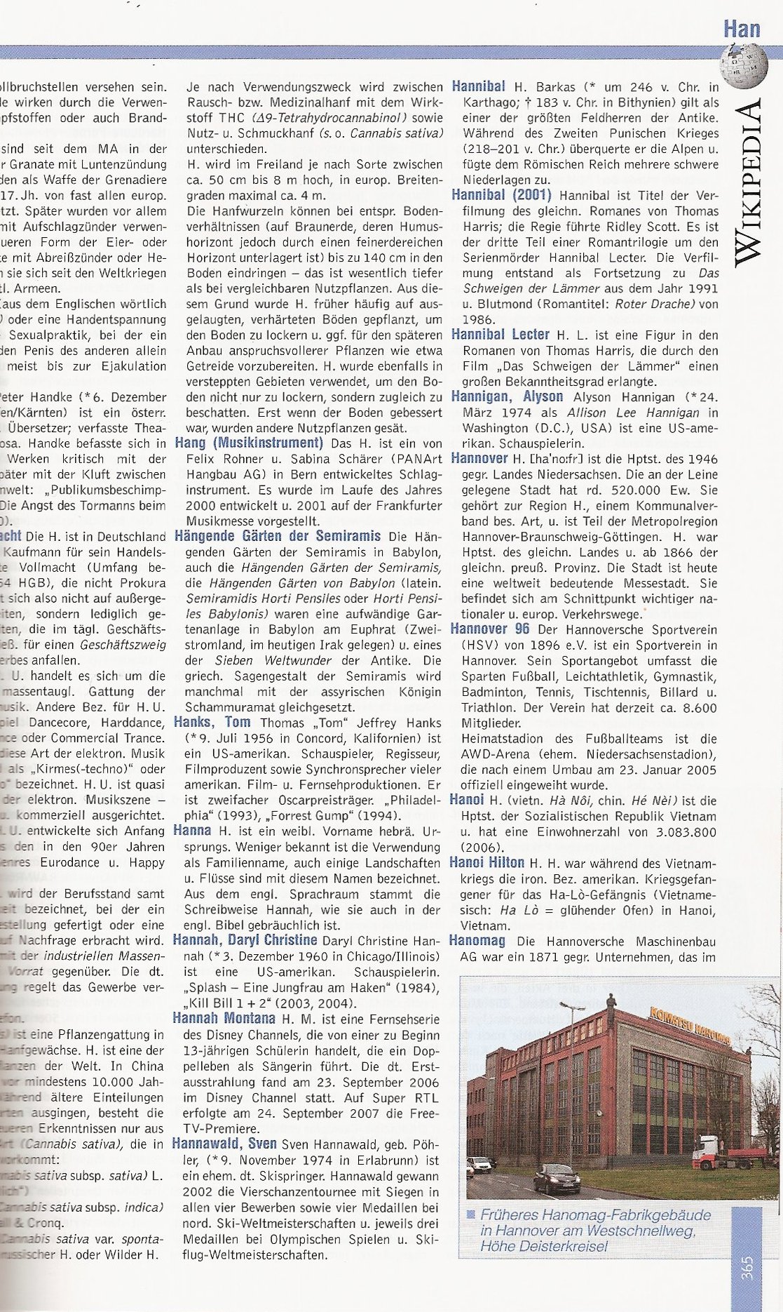 The German media house Bertelsmann has published a paper edition of the German Wikipedia. The resulting «Lexikon» is impressive in several ways. First, it's a sizable hardback volume of 992 pages. The book feels solid when you hold it. It probably fits better on your reference bookshelf at home than in your backpack while travelling. It contains around 20k articles and 1000 figures. The layout is nice, and the binding feels solid. It costs around 20 euros, which I think is less than other «commercial» books of this size. While admiring the three-column layout (see sample on the right), you can feel good about the fact that 20k euros were donated to the German Wikipedia efforts by the publisher.