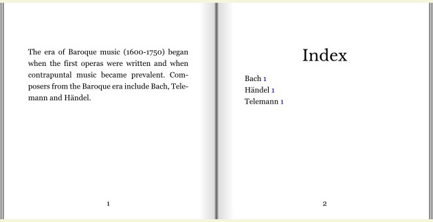 html<script type="text/javascript" src="https://princexml.com/howcome/2021/guides/charms.js"></script> <body onload="index()"> <p>The era of Baroque music (1600-1750) began when the first operas were written and when contrapuntal music became prevalent. Composers from the Baroque era include <span class=ix>Bach</span>, <span class=ix>Telemann</span> and <span class=ix>Händel</span>. <div class=index> <h2>Index</h2> <ol id=index></ol> </div>
