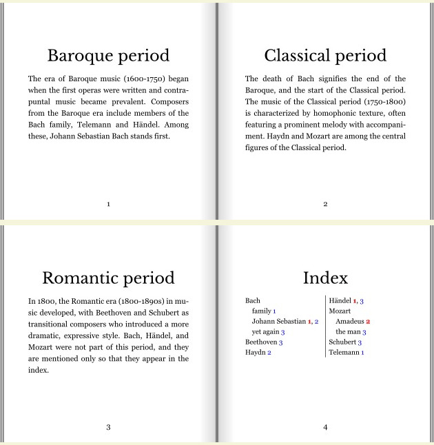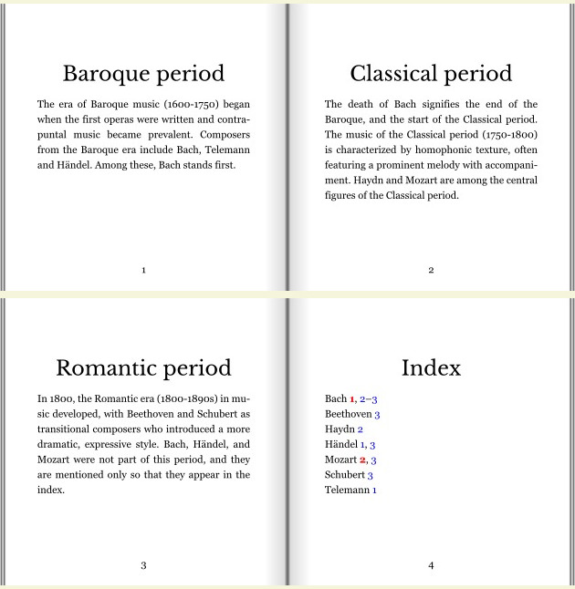 As you can see in the rendered document above right, the three composer names appear in the index. They were added there by the script, which looks for certain elements; span elements of class ix will be pointed to from the index, and their content will be used as the index entry.