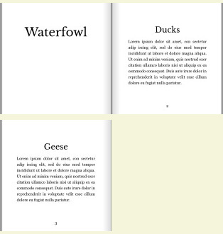 htmlh1, h2 { break-before: page } <h1>Waterfowl</h1> <h2>Ducks</h2> ... <h2>Geese</h2> ... ...