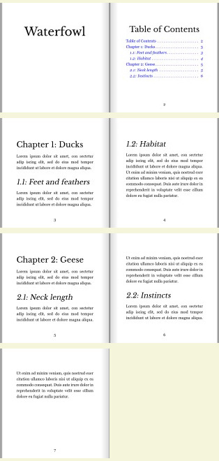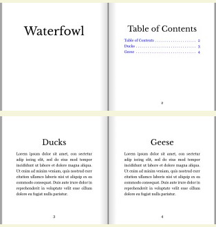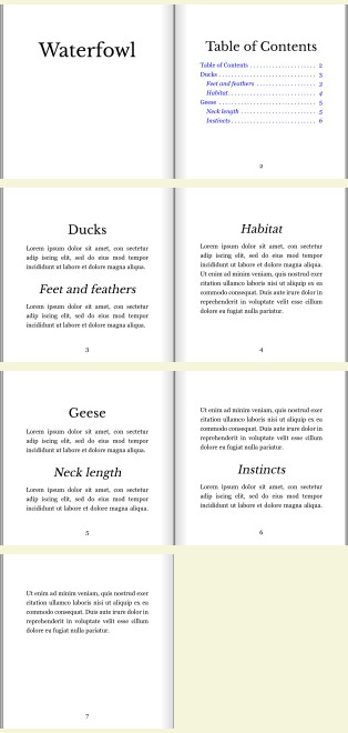 htmlh1, h2 { break-before: page } #toc li { list-style-type: none } #toc li.h3 { margin-left: 3em; font-style: italic } #toc a:after { content: leader('. ') target-counter(attr(href), page) } ... <script type="text/javascript" src="https://princexml.com/howcome/2021/guides/charms.js"> <body onload="simpleToc('h2, h3')"> <h2>Table of Contents</h2> <ol id=toc></ol> <h1>Waterfowl</h1> <h2>Ducks</h2> ... <h3>Feet and feathers</h3> ... <h3>Habitat</h3> ... <h2>Geese</h2> ... <h3>Neck length</h3> ... <h3>Instincts</h3> ...