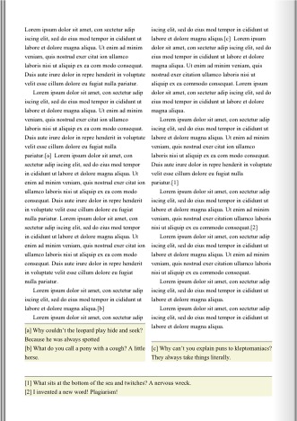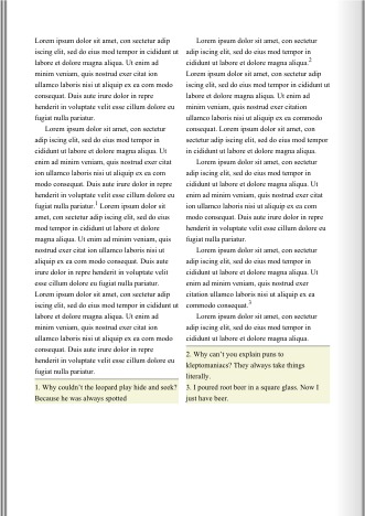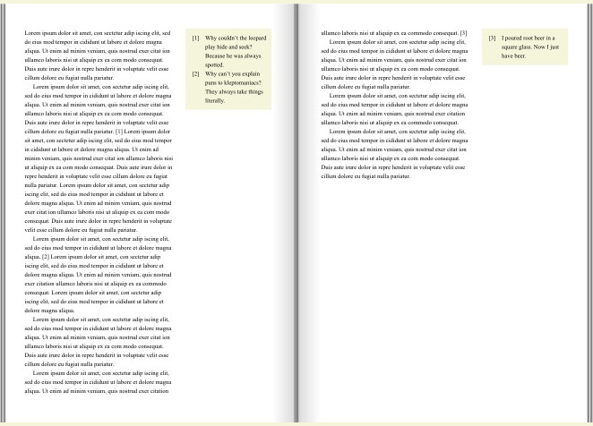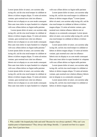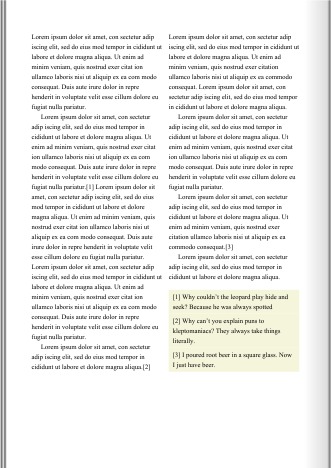 By treating elements like page floats instead of footnotes, some new formatting options appear. In this example, all footnotes on a page will be displayed in the last column. However, page floats are not real footnotes and you will need to create the footnote calls and markers yourself. Or, you can let a script do the job, like here: